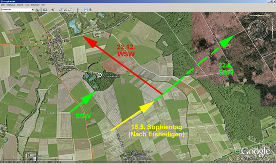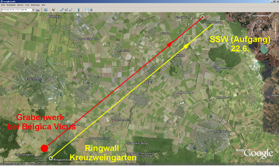 Die Linien sind 13,8 km lang und verlaufen im Abstand von 800 m parallel nebeneinander. Wer in Kreuzweingarten am 22.6. morgens 5.26 Uhr steht, sieht oberhalb des Horizontes bei Dünstekoven die Sonne aufgehen. Der etwa 40 m unterhalb des Horizontes liegende Kreis liegt zwar an der Sommersonnenwendaufgangslinie zum Kreuzweingartener Grabenwerk, kann jedoch nicht als Visierpunkt für Horizontbetrachtungen angesehen werden. Eine radiästhetische Untersuchung steht noch aus.