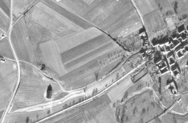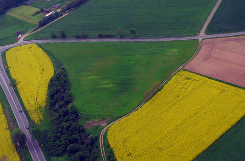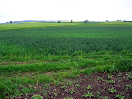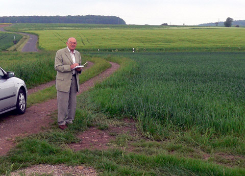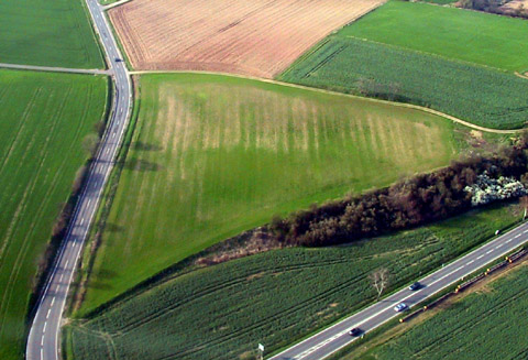 Die radiästhetischen Betrachtungen wurden von Herrn Bongart aus Eschweiler durchgeführt. Seine Ausführungen befinden sich andernorts. Auf der folgenden Abbildung sieht man die dunkelgrüne Einfärbung des jungen Getreides. Hier etwa im Radius von etwa 7 Metern wurde ein Kalenderstandort lokalisiert. Im Hintergrund liegt die Billiger Kirche. Sie ist ungefähr die Visierrichtung für den Sonnenuntergang, der am 21. Juni um etwa 21.46 Uhr stattfindet.