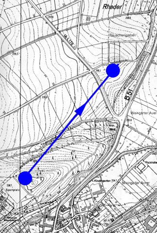 Rheder Am 17. Mai 2006 wurde eine Begehung einiger Kultstätten bei Kreuzweingarten durchgeführt. Konkrete Ausgrabungen nach vorzeitlichen Anlagen oder Kalenderstandorten hat es nie gegeben; eine radiästhetische Auswertung war wünschenswert geworden, da einige Luftaufnahmen nur geringe Aufschlüsse über verschiedene Standorte zuließen. Ebenso war eine Ringwallanalyse vorgesehen. Bevor wir zum Hardtberg fuhren, kamen wir bei Rheder an der Flur Rauschengraben vorbei, welcher aufgrund von Luftaufnahmen und Azimutwertberechnungen als möglicher Kalenderstandort in Frage kommt. Darum zu Beginn erst hierüber ein Bericht. Entdeckung von Kalenderlinien Für den Rauschengraben Rheder war festgestellt worden, daß es sich offenbar um einen Kultort handelt, der zu Kalenderzwecken diente. Anhand eines Azimutwertberechnungsprogrammes und topografischer Kartenauswertungen fand sich eine Kalenderlinie in einem Gebiet, welches von römischen, keltischen und vorzeitlichen Stätten gut bestückt ist. Hierzu wurde die folgende Karte erstellt, wovon den Rauschengraben nur die rechts abgebildete Linie betrifft. Von einer topografischen Höhe im Hardtwald Nähe Hubertuskreuz (H) verläuft über den Standort Rauschengraben (R) eine Kalenderlinie über Belgica Vicus (V) und den Kaiserstein (KS) zur Kapelle Billig (P). Die Erklärung der anderen Linien geschieht andernorts.