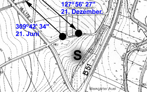 Der Standort am TP 242,3 in der Nähe des Kreuzweingartener Sportplatz ist für eine Mondaufgangsbetrachtung geeignet. Diese findet etwa alle 28 Tage statt. Eine weitere Untersuchung dieser Kalenderlinie ist hier an dieser Stelle nicht vorgesehen. An Stelle der abgebildeten Scheune S befindet sich 2006 eine Scharrung. Diese ist auch am Punkte Sch ersichtlich. Ende der 50er Jahre wurde an bezeichneter Stelle das Martinsfeuer abgebrannt. Unmittelbar im Bereich der drei Kultorte verlief der Römerkanal entlang etwa der Höhenlinie 215 m.