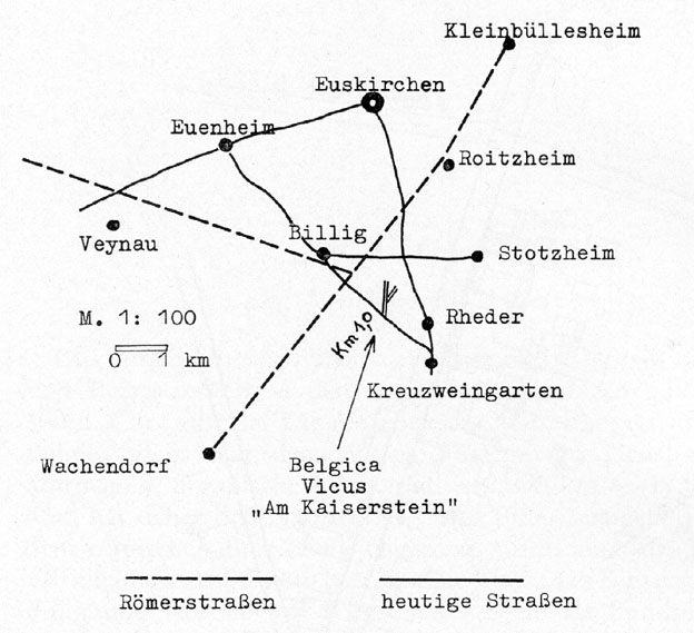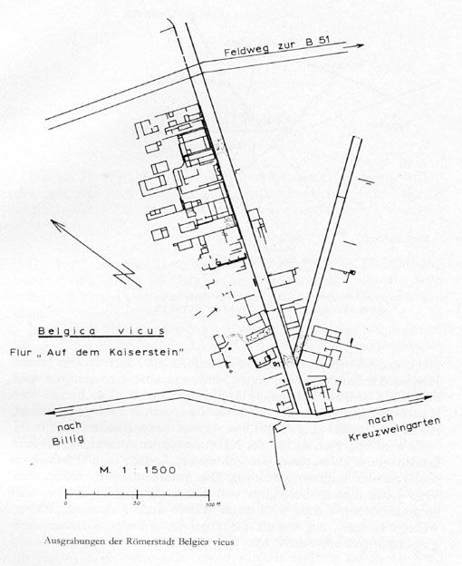 Vicus Das Itinerarium provinciarium Antonini Augusti, ein Verzeichnis von Reisestrecken in den römischen Provinzen aus der Zeit um 300 n. Chr. gibt die Längen einzelner Reiseetappen an. Eine Station Belgica vicus war danach von Marcomago vicus, dem heutigen Marmagen, 8 gallische Leugen zu je 2,200 km = 17,8 km entfernt. Man hat daher den Namen des Ortes Billig seit dem Jahre 1821 mit dem römischen Belgica gleichgesetzt, wenn auch die Entfernung in Wirklichkeit grob 23 km beträgt. Die Flur "Am Kaiserstein" zwischen Billig und Rheder war schon seit langem als Fundplatz römischer Altertümer wie Tonscherben, Ziegel, Mauerreste und anderem bekannt, bis dann in den siebziger Jahren des vorigen Jahrhunderts in größerem Ausmaß dort gegraben wurde. Das Ergebnis dieser Untersuchungen ist in einem seither oft veröffentlichten genauen Plan der aufgedeckten Grundmauern einer ganzen Reihe von Häusern festgehalten.